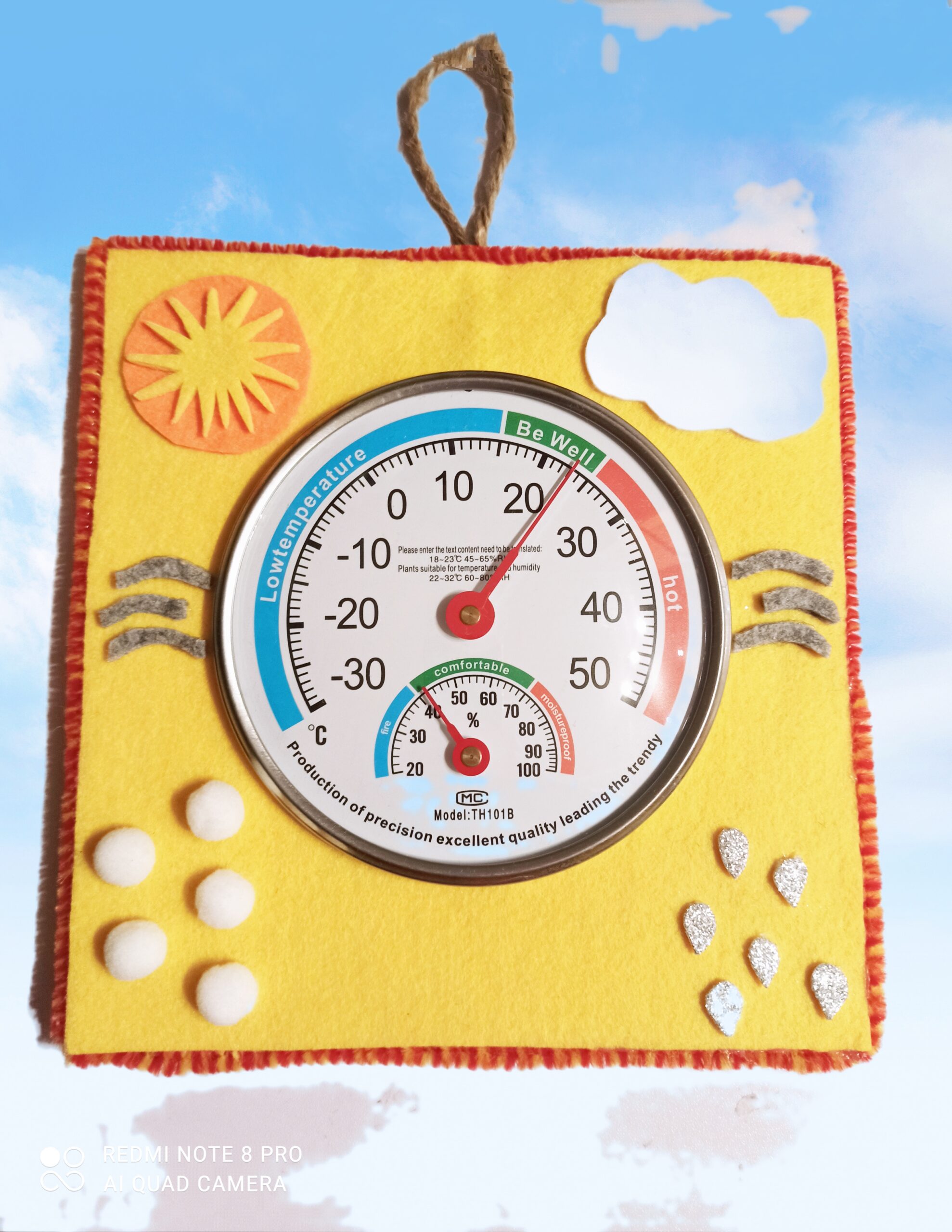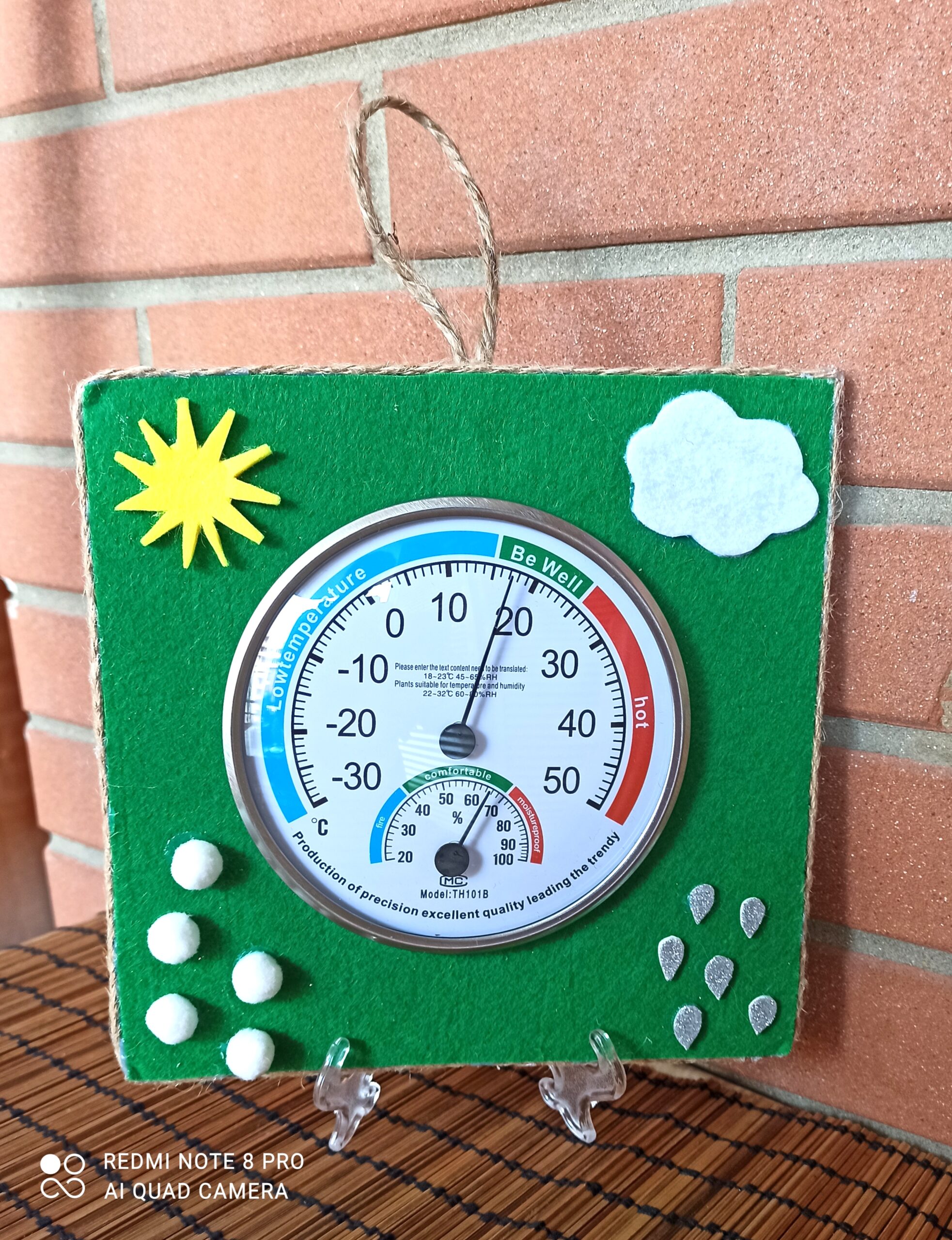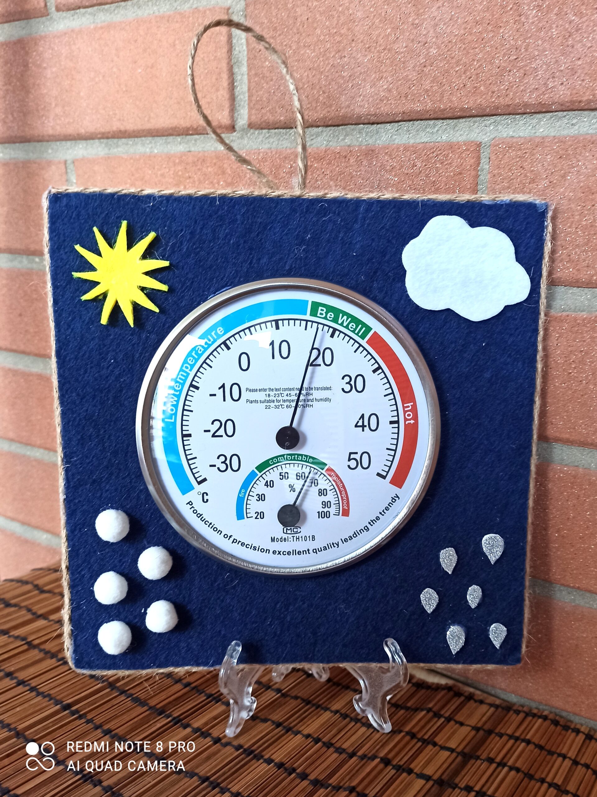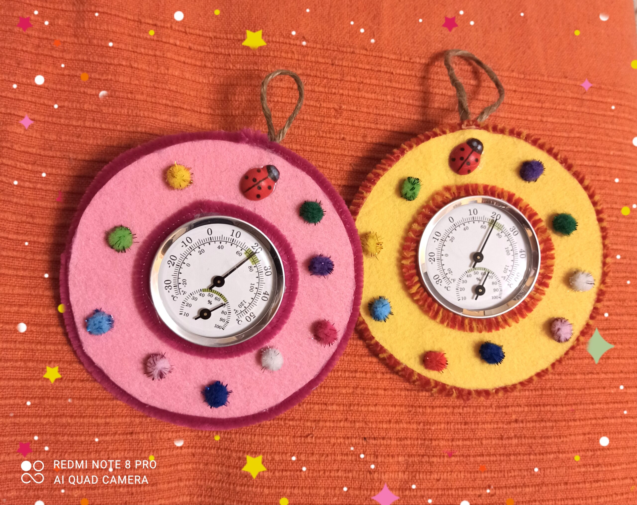 Termometro e Igrometro “Che tempo fa” con cornice in panno Lenci decorato. Versione piccola tonda (diametro 13cm circa) con gancio in corda anche per l’auto.